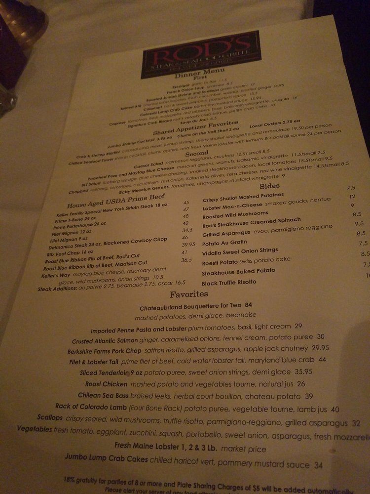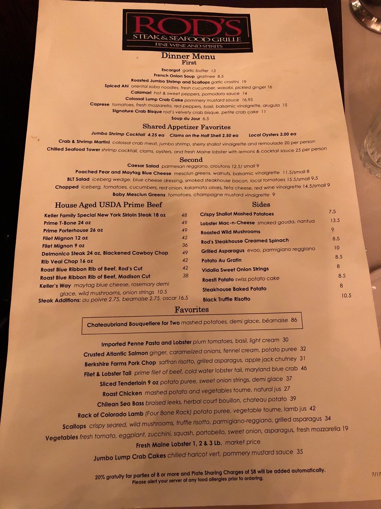 Rod's Steak And Seafood Grille is a classy establishment located in Morristown, NJ, offering a variety of New American dishes, steaks, and seafood options. The menu boasts a wide range of appetizers such as Escargot in garlic and white wine, Rod's Signature Crab Bisque, and Roasted Jumbo Shrimp and Scallops. For mains, indulge in House Aged USDA Prime Meat selections like Keller Family Special NY Sirloin Steak and Delmonico Steak. Vegetarians will also find plenty of options to enjoy. The restaurant provides a range of amenities including outdoor seating, free Wi-Fi, and a full bar. Whether gathering for a group dinner or a special occasion, Rod's Steak And Seafood Grille is sure to impress with its delicious offerings and elegant ambiance.